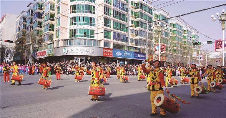 r鼓槌挥舞、鼓身震颤,千面鼓点齐鸣,如黄河奔涌响彻全城,将新春的热烈氛围瞬间推向高潮。太平鼓、舞龙、舞狮、旱船、秧歌、彩旗等特色表演轮番上阵,观众拍手叫好。此次社火展演同步进行了线上直播,直播浏览量突破10万人(次),点赞量超30万次。
