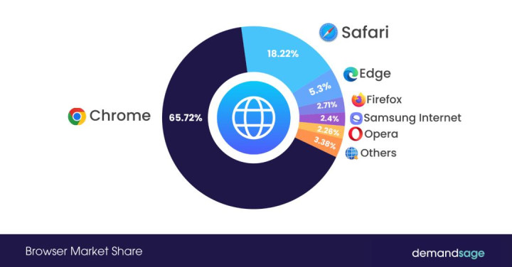 这次Chrome成为主导者,过去十年间市场份额长期保持在60%以上,而最接近的竞争对手苹果Safari则始终徘徊在15%左右。