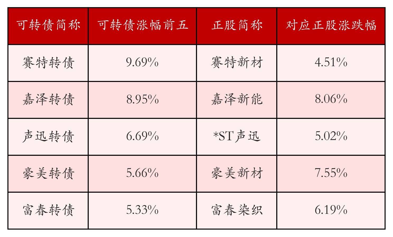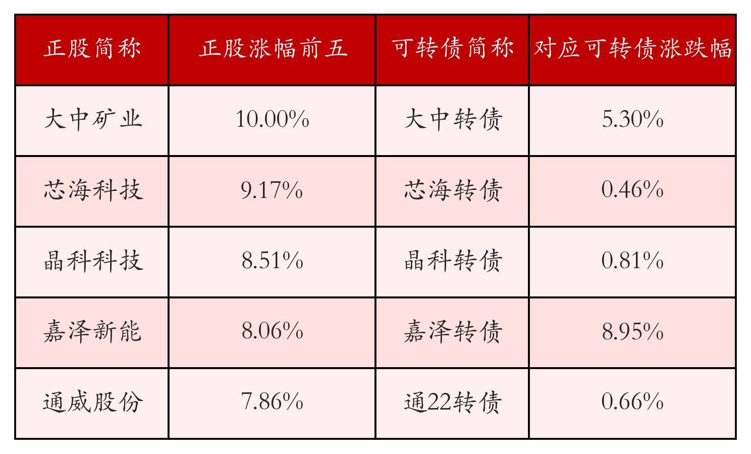 南财智讯4月13日电,盘后数据显示,债市方面,中证转债指数收跌0.44%,报502.65,成交额为611.45亿元。可转债方面炒股配资平台股票配资门户,今日共成交338只可转债炒股配资平台股票配资门户,其中68只收涨,0只收平,270只收跌。具体来看,10只可转债涨幅超过2%。其中赛特转债(118044)涨9.69%,嘉泽转债(113039)涨8.95%,声迅转债(127080)涨6.69%。今日有33只可转债跌幅超2%,博瑞转债(118004)跌6.7%,惠城转债(123118)跌6.15%,家联转债(123236)跌5.6%。存在交易量的可转债所对应的正股中,138只收涨,4只收平,196只收跌。具体来看,17只可转债对应正股涨幅超过5%,其中,大中矿业(001203)涨停,收涨10.0%。同时所对应的可转债:大中转债(127070)同涨5.3%。今日有3只可转债对应正股跌幅超过5%,没有正股跌停。